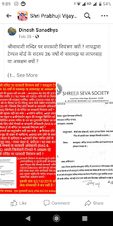 बुरा मत मानो होली है ! सभी खेले अपने अपने रंगों से होली ! ★बोर्ड मेम्बर्स होली खेले - प्रसाद, दर्शन, लापरवाही व स्वहित की होली ! ★नये बोर्ड मेम्बर होली खेले - मन्दिर की लालबाग बस स्टेण्ड की जमीन, श्री गोवर्धन स्कूल व अन्य जमीनो की होली ! ★कलेक्टर होली खेले - जनता की शिकायतों की अनदेखी, मन्दिरों की जमीन पर नगरपालिका की लूट पर चुप्पी, धन के बरबादी की होली ! ★सरकारी अधिकारी होली खेले - मन्दिर की जमीन लूटाने, धन बबार्द करने व अतिक्रमण पर चुप्पी की होली ! ★नेता व सरकार होली खेले - मन्दिर पर अनावश्यक नियंत्रण, धन व जमीन लूटने की होली ! ★मुख्य पुजारी होली खेले - बिना सेवा करें नेग लेने, बृजवासियों को पूरा पैसा नहीं देने व श्रीनाथजी के सखा को नौकर बनाने की होली ! ★बृजवासी होली खेले - हुकुम हुकुम कहने व केवल गुलाल की होली ! ★★★★★★★★★★★★★★★★ श्रीनाथजी की सम्पत्तियों / धन का बोर्ड मैम्बर्स व नेताओं के द्वारा दुरुपयोग होता रहा और सरकार चुप रहेगी तो एक दिन नाथद्वारा की दशा पर "The Nathdwara Files" फिल्म बनानी पड़ेगी ! अतः श्रीनाथजी मन्दिर को "सरकारी नियन्त्रण से मुक्त" कराना अति आवश्यक है ! इससे पूर्व आज की बोर्ड मिटीग मे पांच बिन्दुओं को शामिल करें ! ★★★★★★हमे यह करना है !★★★★★★ श्रीनाथजी की सम्पत्तियों, धन व परम्पराओं की रक्षा करने मे असफल रहने व दुरुपयोग होने के कारण कल 19/03/2022 की मन्दिर बोर्ड मिटींग मे निम्न बिन्दुओं को शामिल करना आवश्यक है ! (१)नाथद्वारा मन्दिर मण्डल की मिटींग मे सामाजिक अंकेक्षण कराने के लिए श्रीजी सेवा सोसायटी के पत्र दिनांक 09/09/2020 को एजेण्डा मे रखे ! (२)लालबाग बस स्टैण्ड की जमीन, लावटी पेट्रोल पम्प की जमीन, बड़ा मगरे की कुछ जमीनो, भीलवाड़ा की जमीनो, पर अतिक्रमण / लूट की गई है उस समस्या को नाथद्वारा मन्दिर मण्डल की मिटिंग मे रखे ! (३)मन्दिर मे सेवा वालो के वेतन मे वृद्धि करने पर विचार हो ! यदि वेतन वृद्धि नहीं करे तो उसका कारण भी स्पष्ट करे ! (४)सम्पदा अधिकारी मन्दिर की सम्पत्ति बचाने मे असफल होने व कृषि अधिकारी कृषि /दूध उत्पादन मे वृद्धि करने मे असफल होने के कारणों की समीक्षा हो ! (५)नाथद्वारा मन्दिर को सरकारी नियंत्रण से मुक्ति के लिए प्रयास / कार्ययोजना पर विचार हो ! ★★★★★★★★★★★★★★★★ मन्दिर सरकारी नियंत्रण से मुक्त हो ! अपनी पोस्ट का असर, एक वर्ष बाद ! एक बृजवासी ने 18/03/2021 को श्रीनाथजी मन्दिर को सरकारी नियंत्रण से मुक्ति हेतु न्याय युद्ध शुरू किया ! एक वर्ष बाद विधायक दीप्ति माहेश्वरी ने इस बात 18/03/2022 को विधानसभा मे उठाई ! अब आम जनता आगे आये, अभियान चलाकर 18/03/2023 के पूर्व मन्दिर को सरकारी नियंत्रण से मुक्त कराये ! आम जनता जागे, नहीं तो "द कश्मीर फाईल्स" की स्थिति भी आ सकती है ! ★★★★★★★★★★★★★★★★ बुरा मत मानो होली है ! श्रीजी 